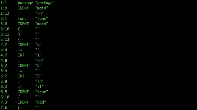这一阶段首先Scanner进行语法分析,会把代码生成Token序列。下面是个简单的Token可视化例子: