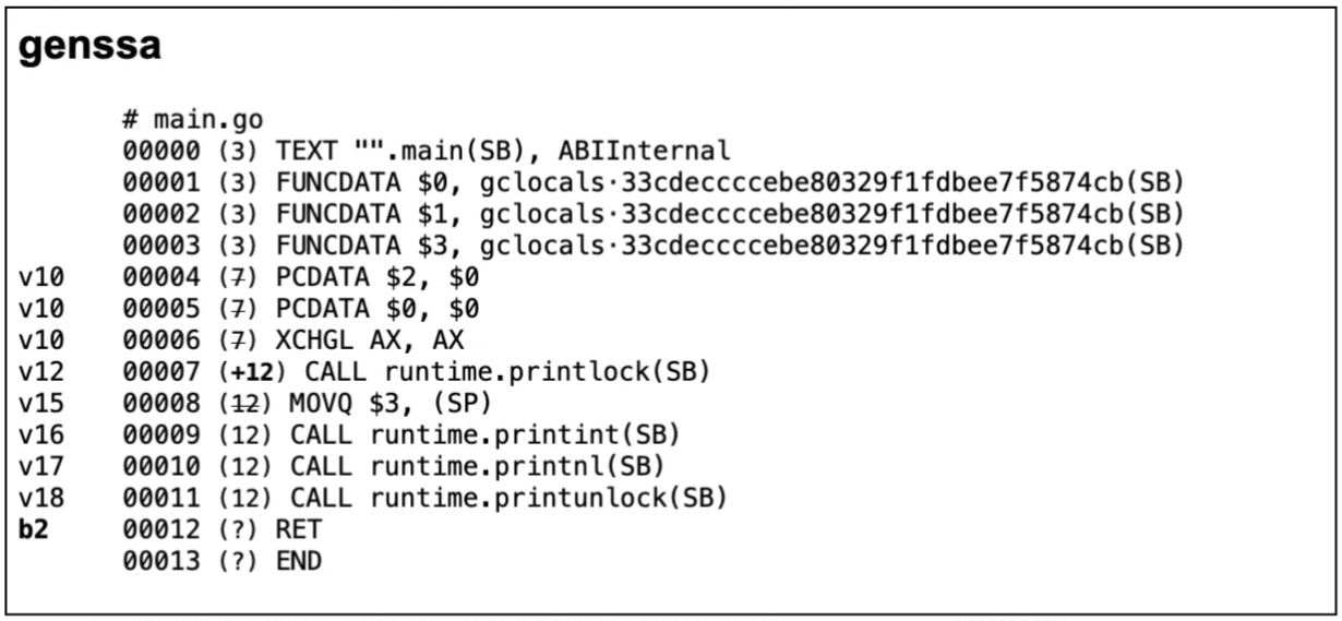 Go 语言的中间代码表示形式为 SSA(Static Single-Assignment,静态单赋值),之所以称之为单赋值,是因为每个名字在 SSA 中仅被赋值一次。