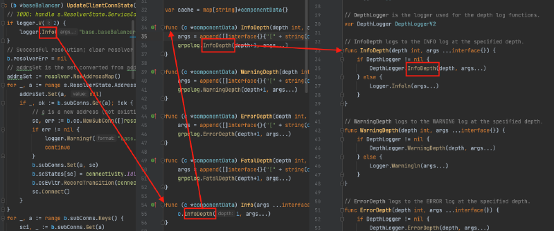 梳理所有grpc-go打印日志的方法(除了测试用的实现方法)会发现:尽管一些方法所属的结构体并不是glogger(一些是下面的componentData),但调用链最终还是会到glogger结构体所属的方法。最后,glogger结构体的方法使用了第三方包“glog”输出日志。