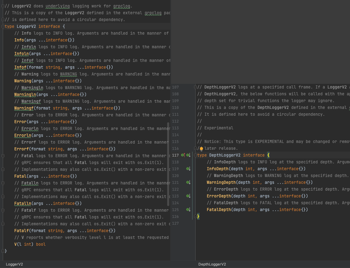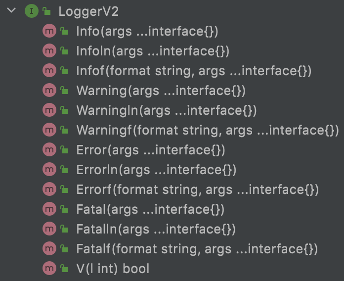 从下边的图可以看出glogger结构体实现了上边LoggerV2接口的所有方法,那么我们可以说glogger结构体实现了LoggerV2接口,而无需像Java一样在类后面显示地用implements声明。