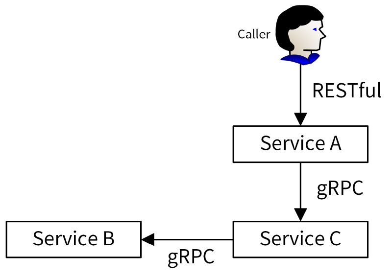 当然,更多的时候,RESTful API 和gRPC API是一种合作的关系,对内业务使用gRPC API,对外业务使用RESTful API,如下图所示: