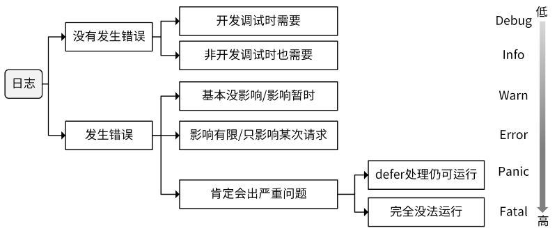 这里用一张图来总结下,如何选择Debug、Info、Warn、Error、Panic、Fatal这几种日志级别。