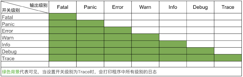 如果开关级别设置为 L ,只有输出级别 >=L 时,日志才会被打印。例如,开关级别为Warn,则只会记录Warn、Error 、Panic 和Fatal级别的日志。具体的输出关系如下图所示:
