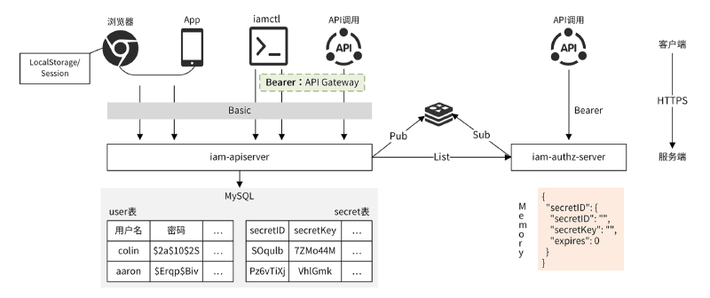 控制台、App端需要登录系统,所以需要使用用户名:密码这种认证方式,也即Basic认证。iamctl、API调用、Go SDK因为可以不用登录系统,所以可以采用更安全的认证方式:Bearer认证。同时,Basic认证作为iam-apiserver已经集成的认证方式,仍然可以供iamctl、API调用、Go SDK使用。