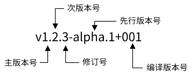 你可能还看过这么一种版本号:v1.2.3-alpha。这其实是把先行版本号(Pre-release)和版本编译元数据,作为延伸加到了 主版本号.次版本号.修订号 的后面,格式为 X.Y.Z[-先行版本号][+版本编译元数据],如下图所示: