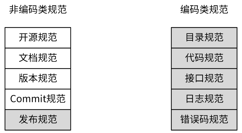一个项目的规范设计主要包括编码类和非编码类这两类规范。今天我们一起学习了开源规范、文档规范和版本规范,现在我们回顾一下重点内容吧。