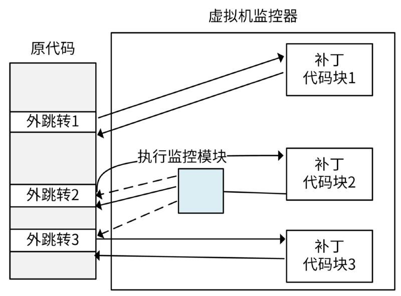 在性能上,二进制代码翻译跟扫描与修补技术各有长短,但是实现方式最为复杂。它的过程如下图所示: