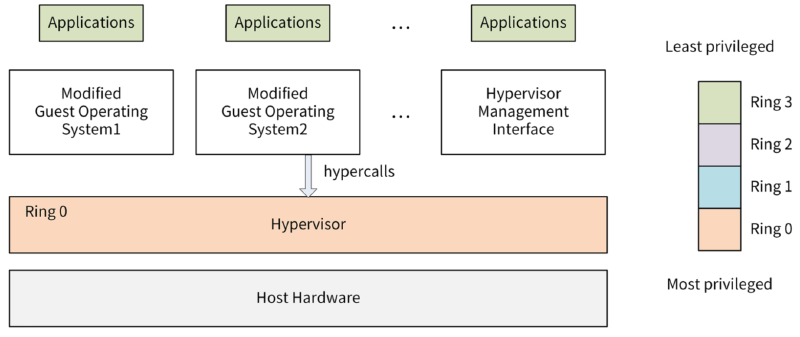 软件辅助的完全虚拟化对x86的指令做了翻译或者模拟,在性能上,多多少少都会有些损失,而这些性能损失在一些生产级的场景是不可接受的。所以,在2003年出现了Para-virtualization技术,也叫半虚拟化/类虚拟化。和之前的虚拟化技术相比,Para-virtualization在性能上有了大幅度的提升,甚至接近于原生的物理机。
