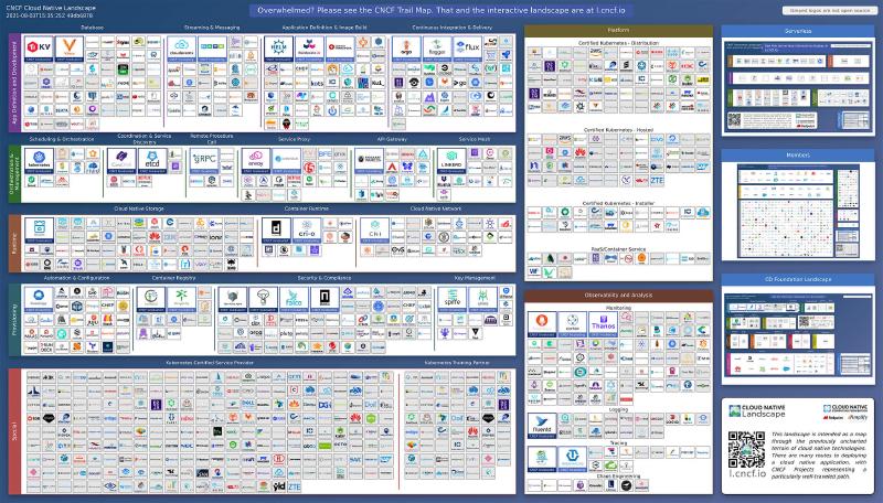CNCF目前托管了非常多的开源项目,其中有很多我们耳熟能详的项目,例如 Kubernetes、Prometheus、Envoy、Istio、etcd等。更多的项目,你可以参考CNCF公布的Cloud Native Landscape,它给出了云原生生态的参考体系,如下图所示: