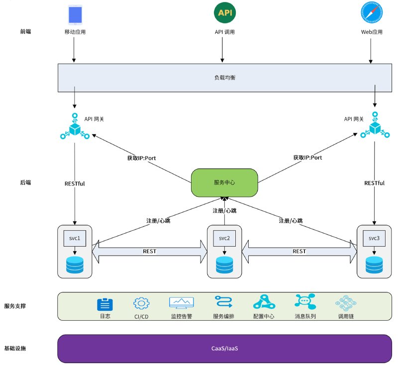 我们在微服务的最上面挂载负载均衡。客户端,例如移动端应用、Web应用、API调用等,都通过负载均衡来访问微服务。