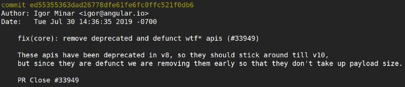 为了方便你理解 Angular 规范,我们直接看一个遵循 Angular 规范的 commit 历史记录,见下图: