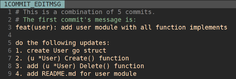 git rebase -i <commid ID>这里的 commit ID 一定要是需要合并 commit 中最旧 commit 的父 commit ID。- 我们希望将 feature/user 分支的 5 个 commit 合并到一个 commit,在 git rebase 时,需要保证其中最新的一个 commit 是 pick 状态,这样我们才可以将其他 4 个 commit 合并进去。