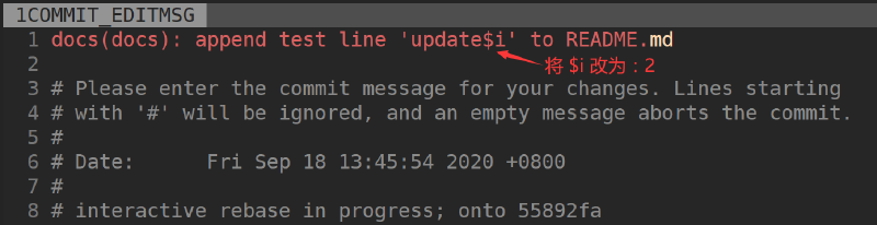可以看到倒数第 2 次提交的 Commit Message 是:docs(docs): append test line 'update$i' to README.md,其中 update$i 正常应该是 update2。