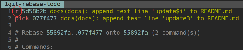 在 Git 仓库下直接执行命令 git rebase -i 55892fa,然后会进入一个交互界面。在交互界面中,修改最近一次的 Commit Message。这里我们使用 reword 或者 r,保留倒数第二次的变更信息,但是修改其 message,如下图所示: