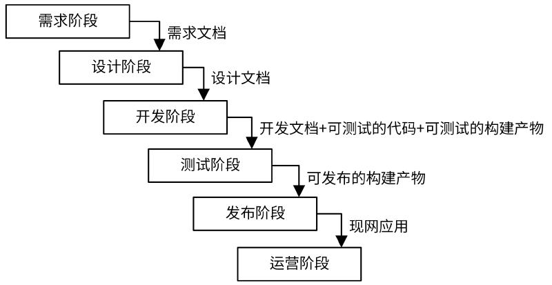 瀑布模式按照预先规划好的研发阶段来推进研发进度。比如,按照需求阶段、设计阶段、开发阶段、测试阶段、发布阶段、运营阶段的顺序串行执行开发任务。每个阶段完美完成之后,才会进入到下一阶段,阶段之间通过文档进行交付。整个过程如下图所示。