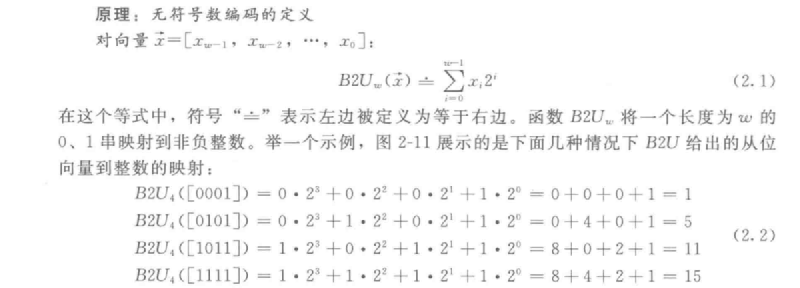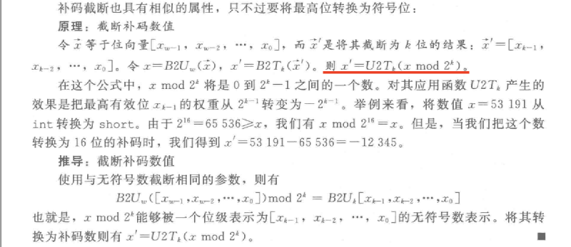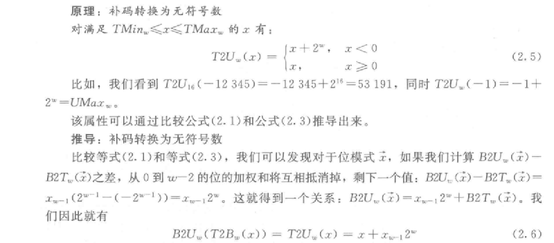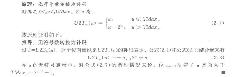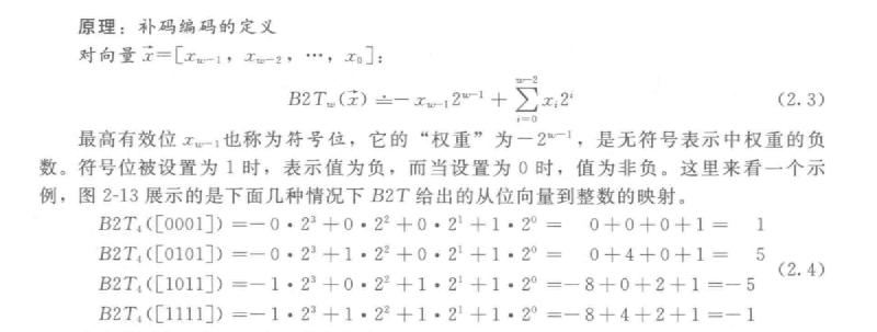 C语言标准并没有要求要用补码形式来表示有符号整数,但是几乎所有的机器都是这么做的。在补码(two’s -complement )的定义中,将字的最高有效位解释为负权(negative-weight)。